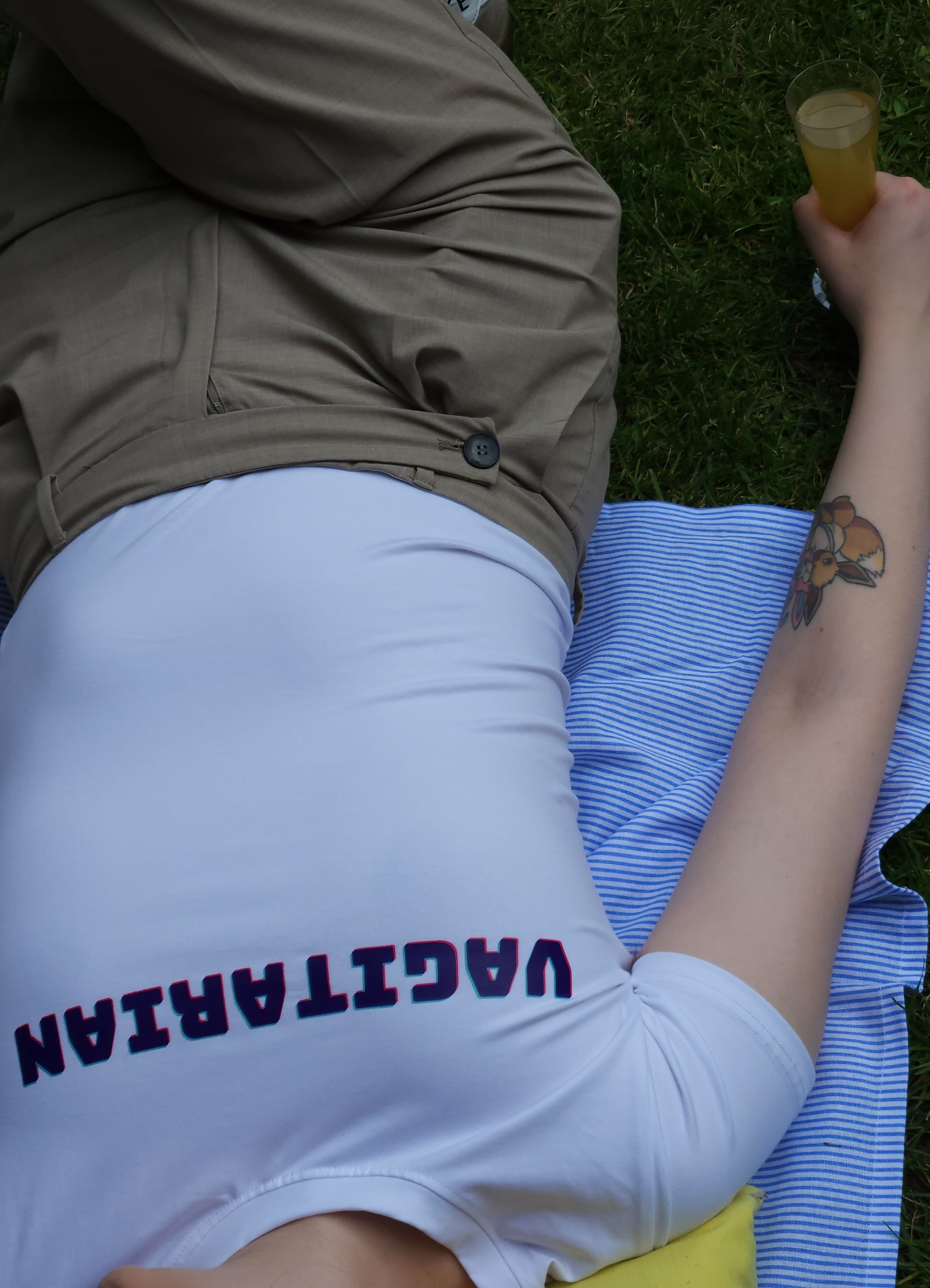 Bold statement tee featuring “Vagitarian” text in eye-catching typography. Made from premium 92% cotton 8% elastane blend for exceptional comfort and perfect stretch that moves with you.